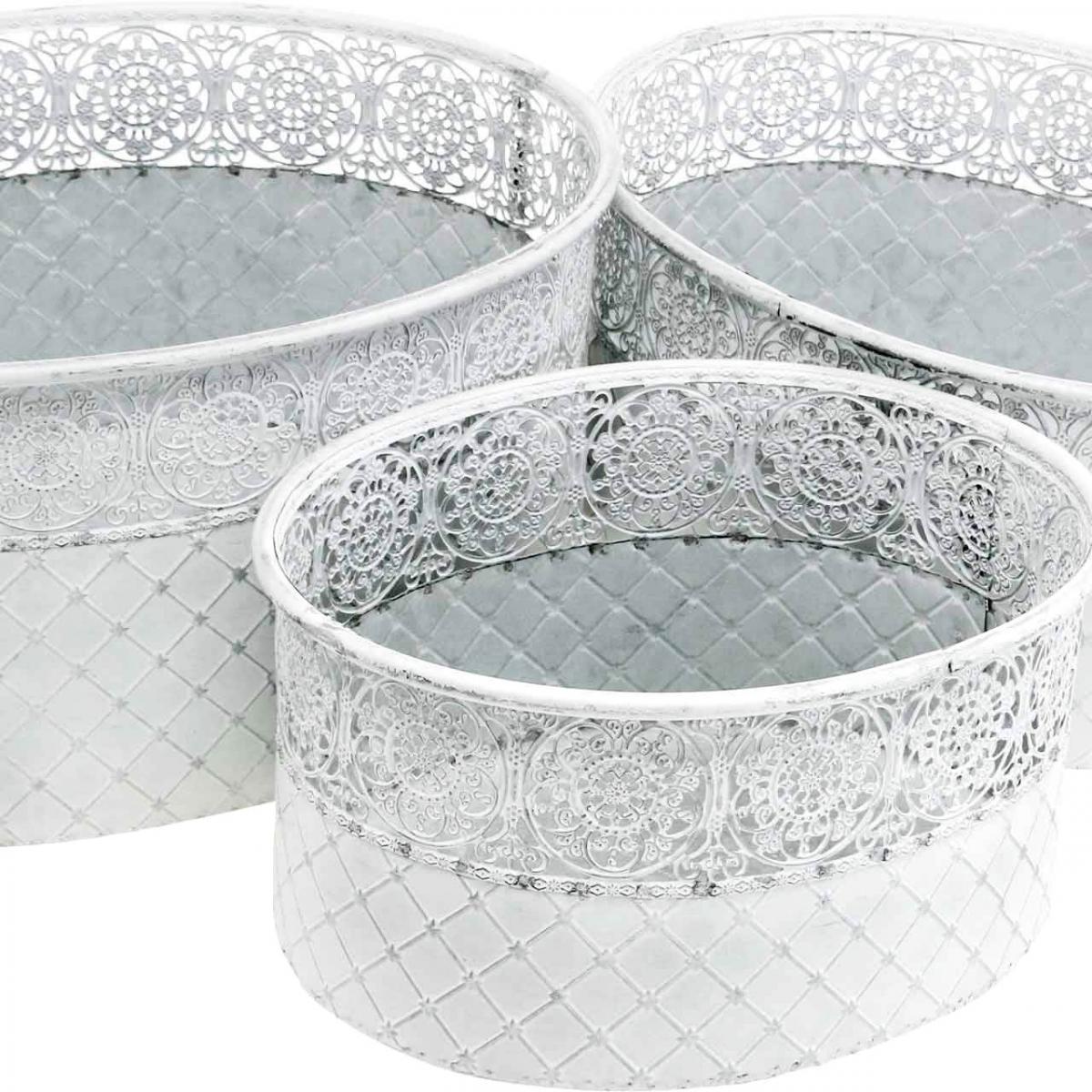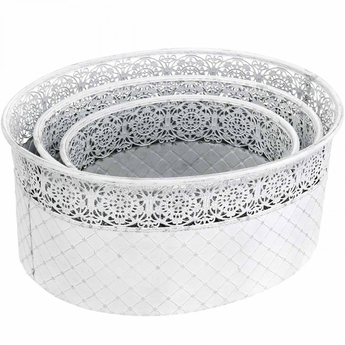 Schale zum Bepflanzen, Metallgefäß mit Spitzenmuster, Dekotopf oval Weiß, Silbern Shabby Chic L41,5/35/29,5cm H19/16/14,5cm 3er-Set