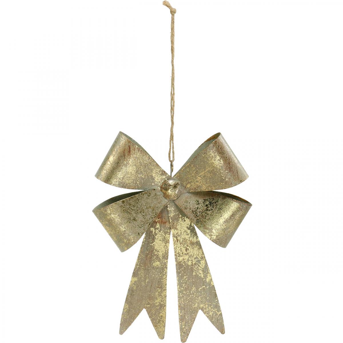 Produktname: Schleife zum Hängen, Christbaumschmuck, Metalldeko Golden, Antik-Optik H23cm B16cm