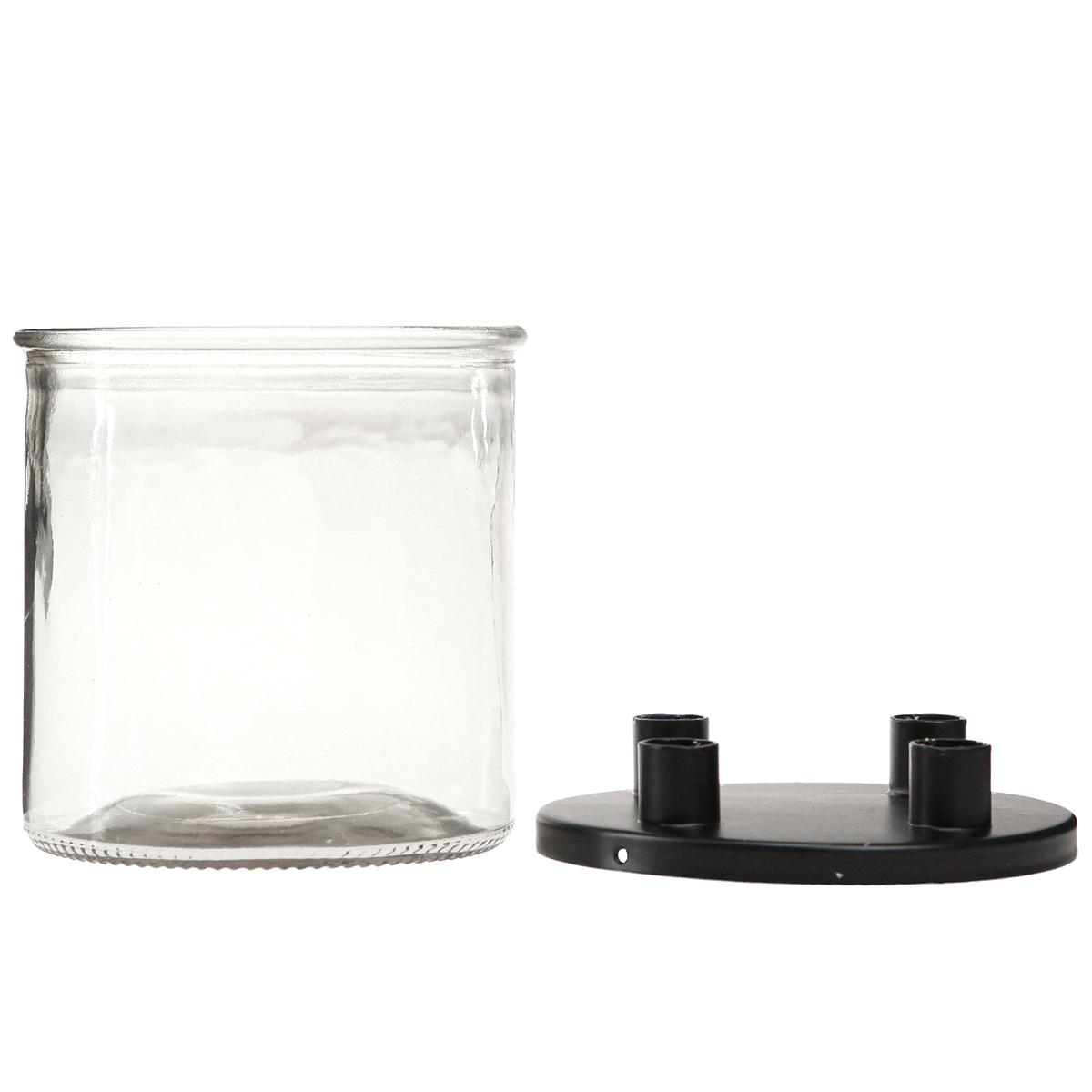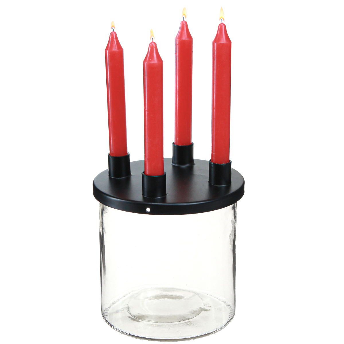 Im Metalldeckel befinden sich vier Halterungen für kleine Stabkerzen oder Pyramidenkerzen mit einem Durchmesser von circa 1,3 Zentimetern. Während der obere Teil als Kerzenhalter dient, lässt sich das Deko-Glas mit Deko-Elementen befüllen und vielfach schmücken.