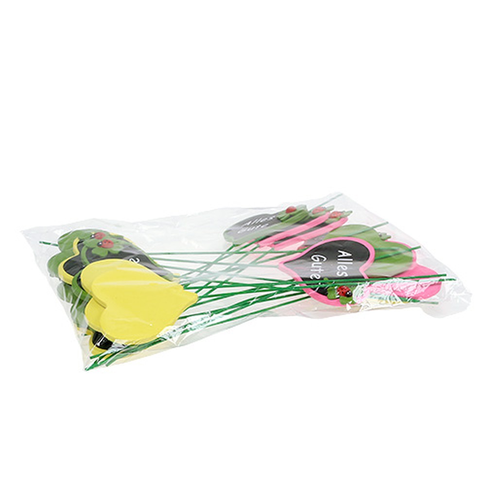 Der Stecker Herz mit dem Satz „Alles Gute“ befindet sich in einem sortierten Beutel zu insgesamt 16 Stück und ist in 3 Gruppen aufgeteilt. Dabei unterscheiden sich die drei Gruppen nur durch die Außenfarbe der Herzen. Dort können Sie dann grüne, rosa und gelbe Herzen sehen, die alle jedoch dieselbe Größe von ungefähr 8 Zentimetern besitzen. Mit dem grünen Holzstab sind die Deko-Herzen circa 27,5 Zentimeter lang und haben neben dem weißen Schriftzug auf schwarzem Untergrund noch die schwarz-roten Marienkäfer auf einem grünen Kleeblatt gemein, der auf der rechten Seite der Herzen prangt.