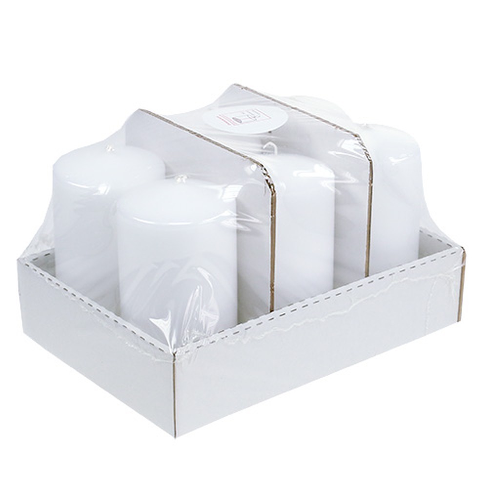 Die Stumpenkerze in Weiß wird als 6er-Set angeboten und hat eine Höhe von ungefähr 150 Millimetern bei einer Breite von 80 Millimetern. Durch die spezielle Sicherheitsfolie an Boden wird ein unkontrolliertes Abbrennen verhindert.