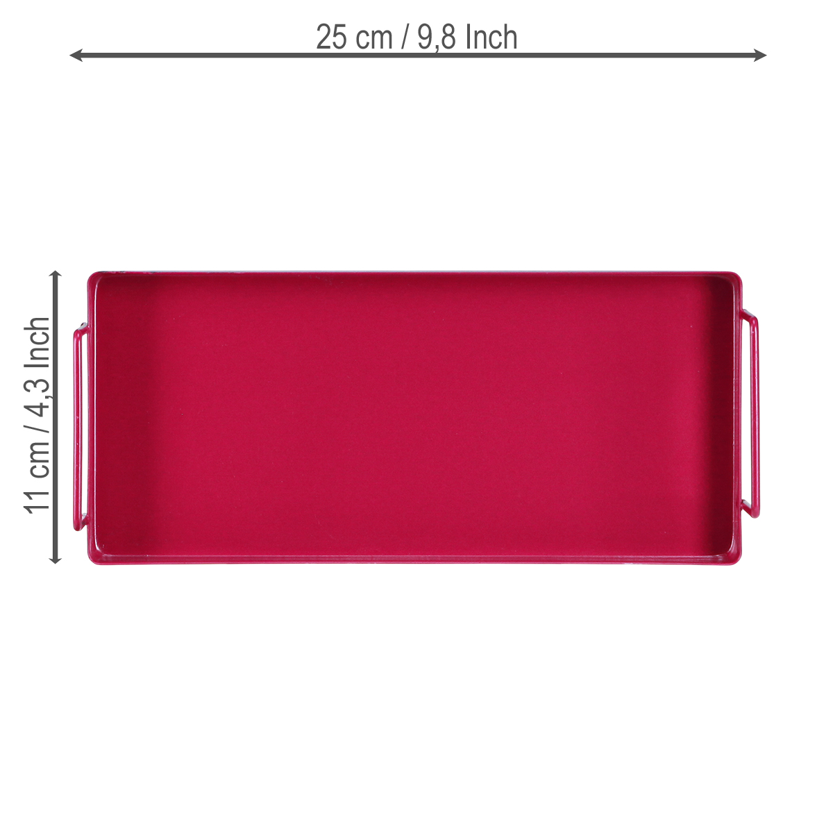 Das minimalistische rote Tablett kombiniert zeitlose Eleganz und praktische Vielseitigkeit. Mit einer Länge von 25 cm, 11 cm Breite und 3 cm Höhe passt es mühelos auch in kleinere Räume. Die robuste Metallverarbeitung sorgt für Langlebigkeit und Stabilität, während die glatte, glänzende Oberfläche seine hochwertige Optik betont.