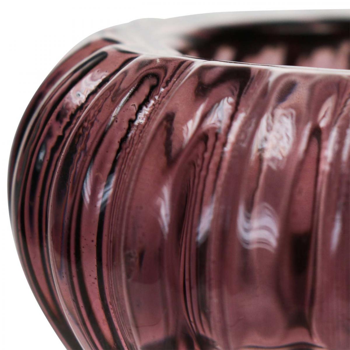 Das dicke, getönte Glas mit dem markanten Lamellenmuster lässt den Kerzenhalter zwischen Lila und Klar leicht changieren. So entsteht ein faszinierender Schimmer, wann immer Sie den runden Kerzenhalter drehen.