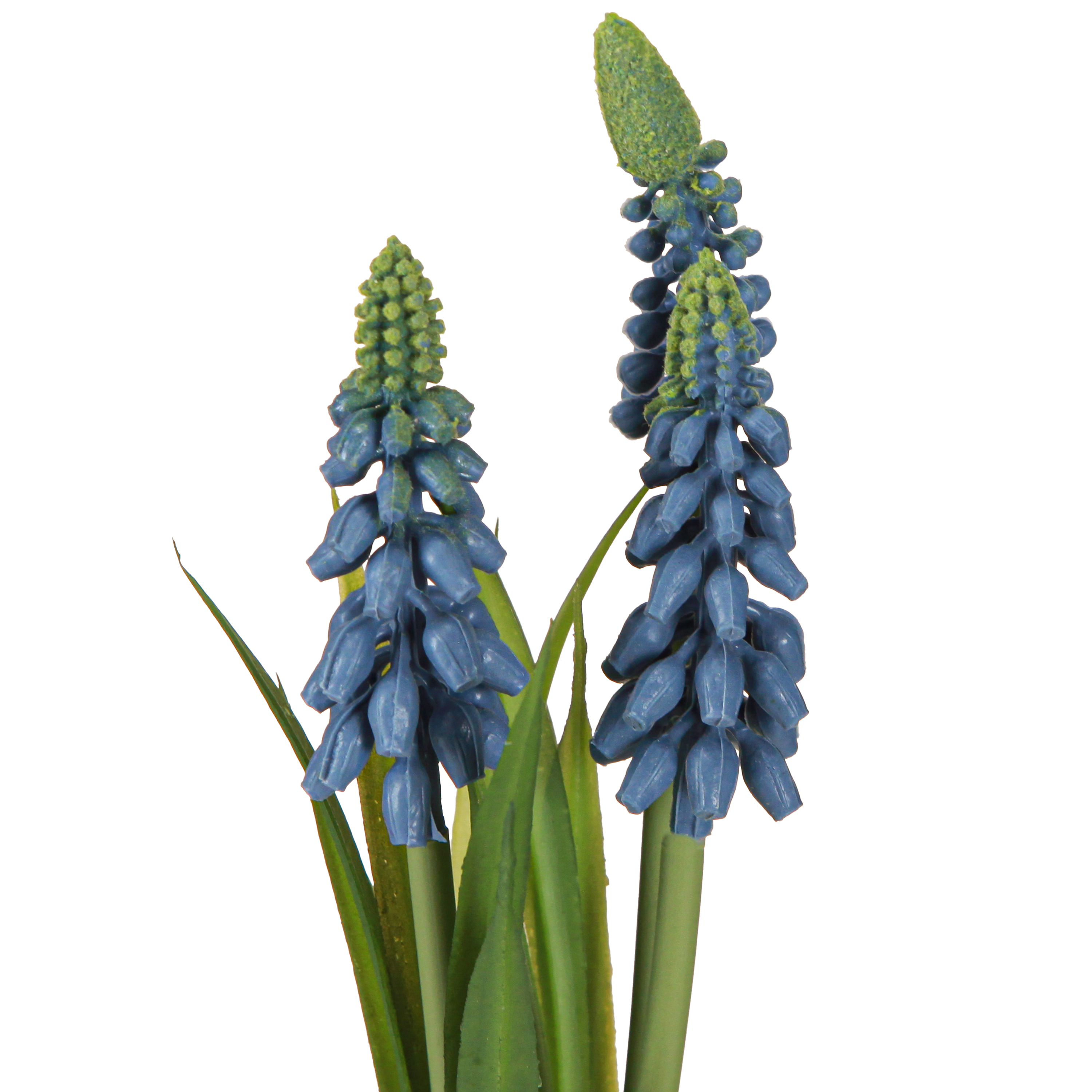 Die Kunstblume ist detailgetreu aus Kunststoff gefertigt und überzeugt durch ihre täuschend echte Optik. Im Glas sind die Wurzeln der Traubenhyazinthe sichtbar, was ihr ein charmant reales Aussehen verleiht.