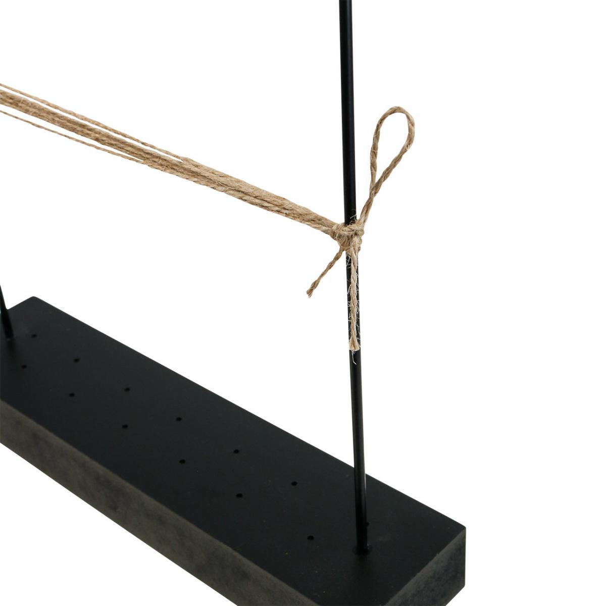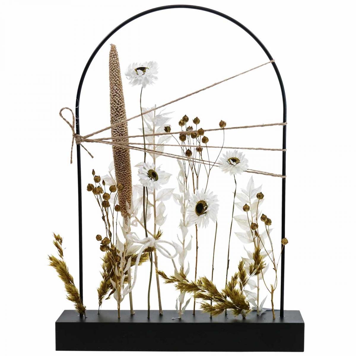 Die Trockenblumen-Holzleiste mit Metallbogen in Schwarz hat eine ungefähre Höhe von 34,5 Zentimetern bei einer Länge von etwa 25 Zentimetern. Bei uns im Shop finden Sie auch eine kleinere Ausführung der Trockenblumenleiste.