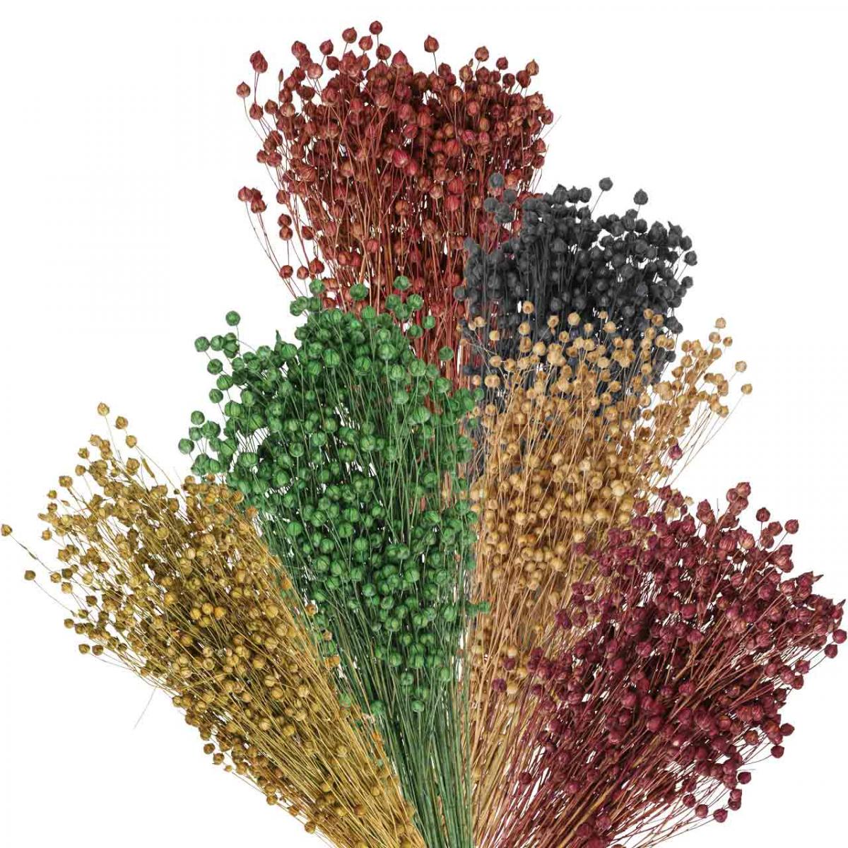 Im Online-Shop finden Sie getrockneten Flachs in den modischen Farben Schwarz, Hellrosa, Altrosa, Grün, Olivgrün und Natur.