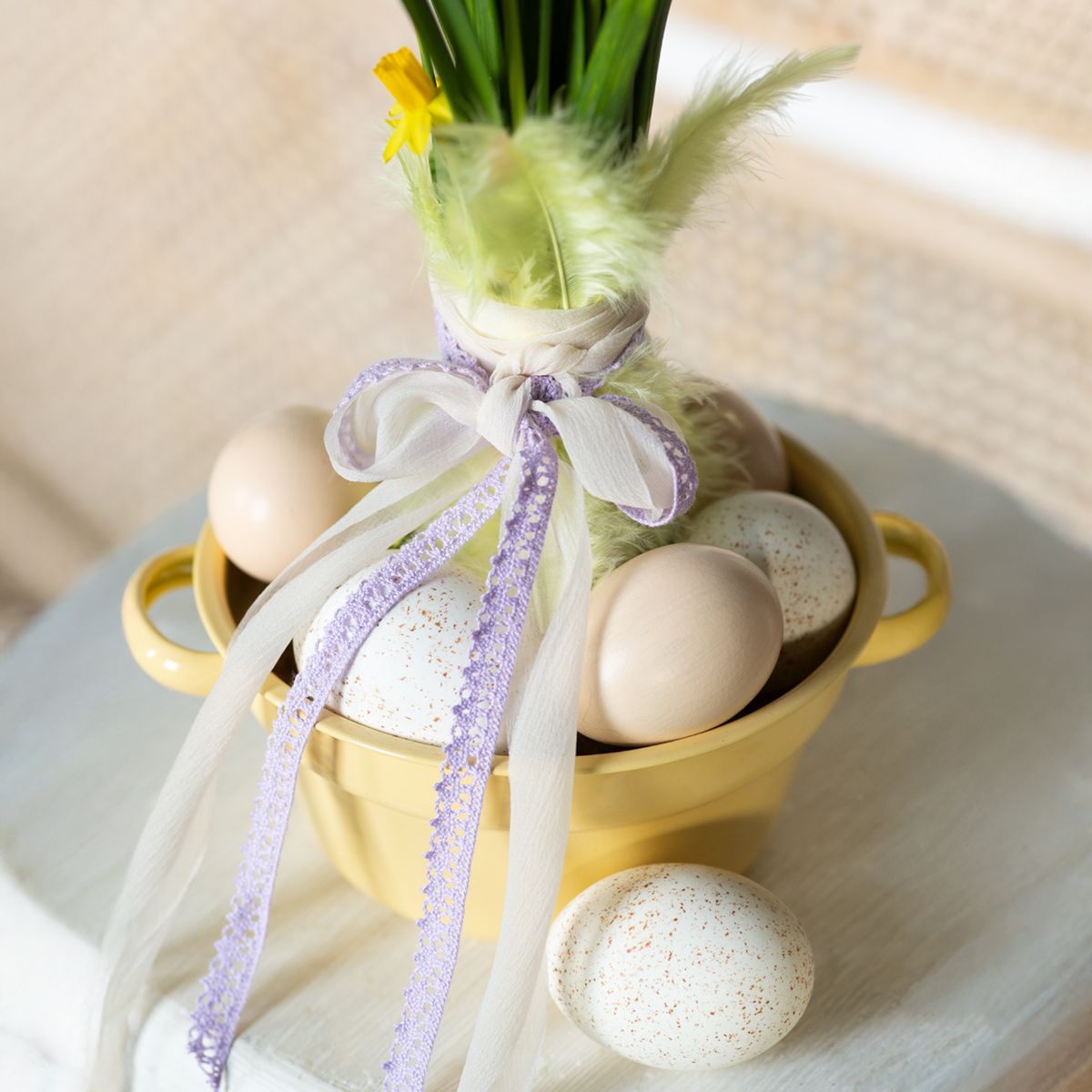 Aus den Dekoeiern lassen sich beispielsweise wunderschöne Osterhänger basteln. Sie müssen gar nicht aufwendig bemalt werden, ist die Sprenkelung doch auch so schon ein echter Hingucker. Es reicht schon, die Ostereier mit einem schmalen Band beziehungsweise einer dekorativen Filzschnur zu umwickeln oder süße Applikation darauf zu kleben. Nun benötigen Sie nur noch etwas Bastschnur, die Sie mit Heißleim an der Oberseite der Eier befestigen – fertig ist der Osterschmuckbehang, den sie wunderbar an einen Osterstrauß aus Weidenkätzchen oder Forsythie hängen können. Eine tolle Idee ist auch ein Osterkranz, den Sie als Türdekoration verwenden können. Sie benötigen nur einen Strohkranz, Federn und etwas Kunstmoos – alles übrigens in unserem Sortiment zu finden. Mit Heißleim können Sie die Ostereier auf den Rohling kleben. Lücken lassen sich ganz einfach mit Moos oder auch Federn schließen. Nun benötigen Sie nur noch eine robuste Bastschnur mit dem Sie den Osterkranz aus Naturartikeln aufhängen können und schon haben Sie eine Osterdekoration, die Ihre ganze Familie begeistern wird.