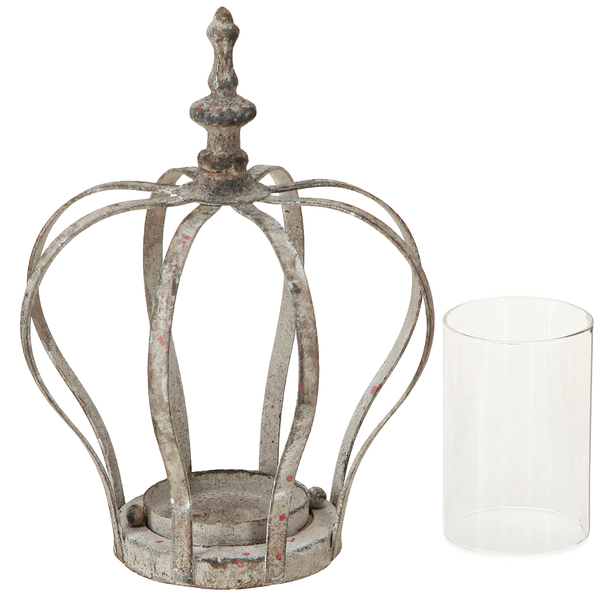 Produktname: Vintage Windlicht Krone Metall Glas Grau Teelicht Halter