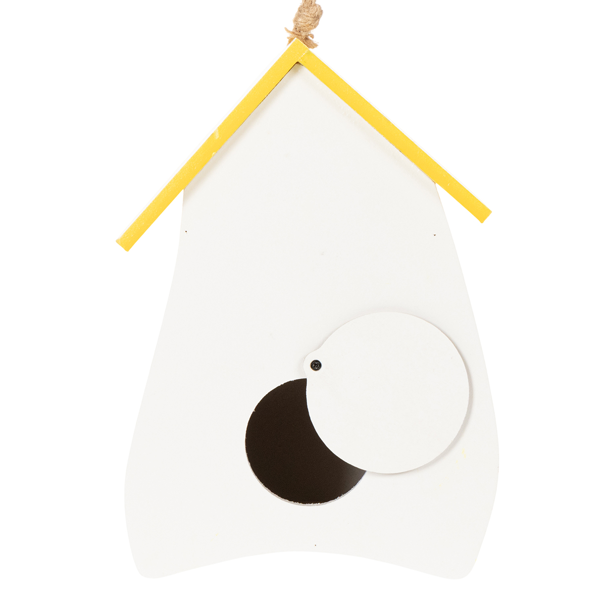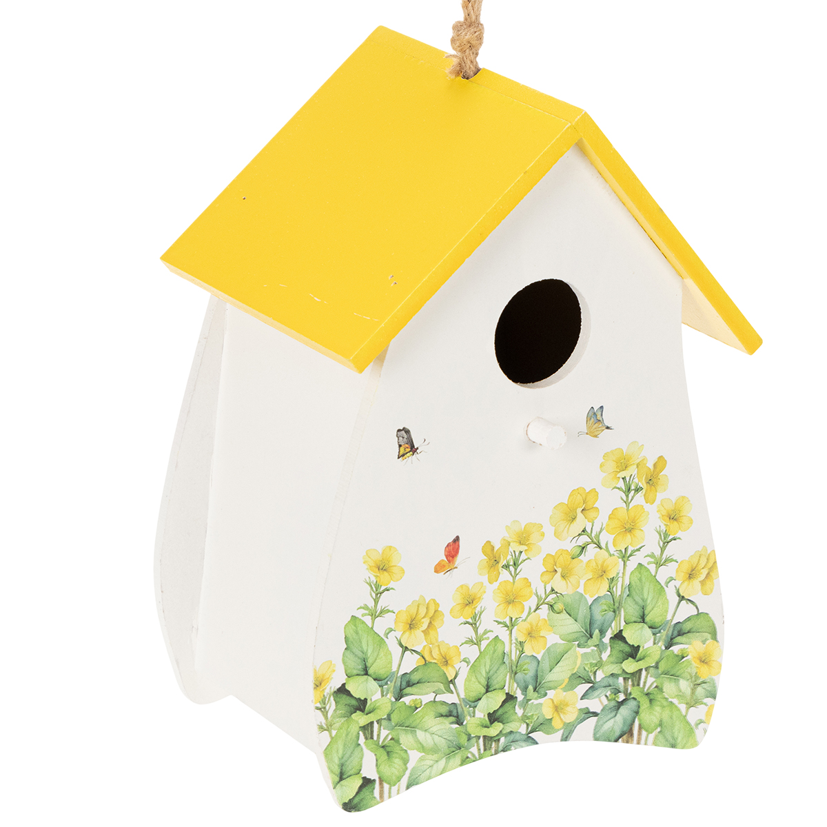 Produktname: Vogelhaus aus Holz mit floralem Muster und gelbem Dach für Innenbereich und Balkon 21 cm