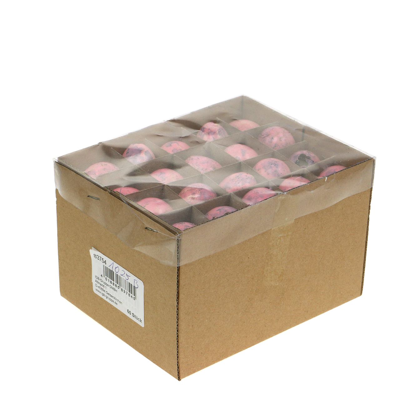 Die Wachteleier in Hellrosa erhalten Sie im Set zu insgesamt 50 Stück, das sicher in einem Karton mit durchsichtigem Deckel geliefert wird. Die Größe der Eier beträgt etwa 3 Zentimeter.