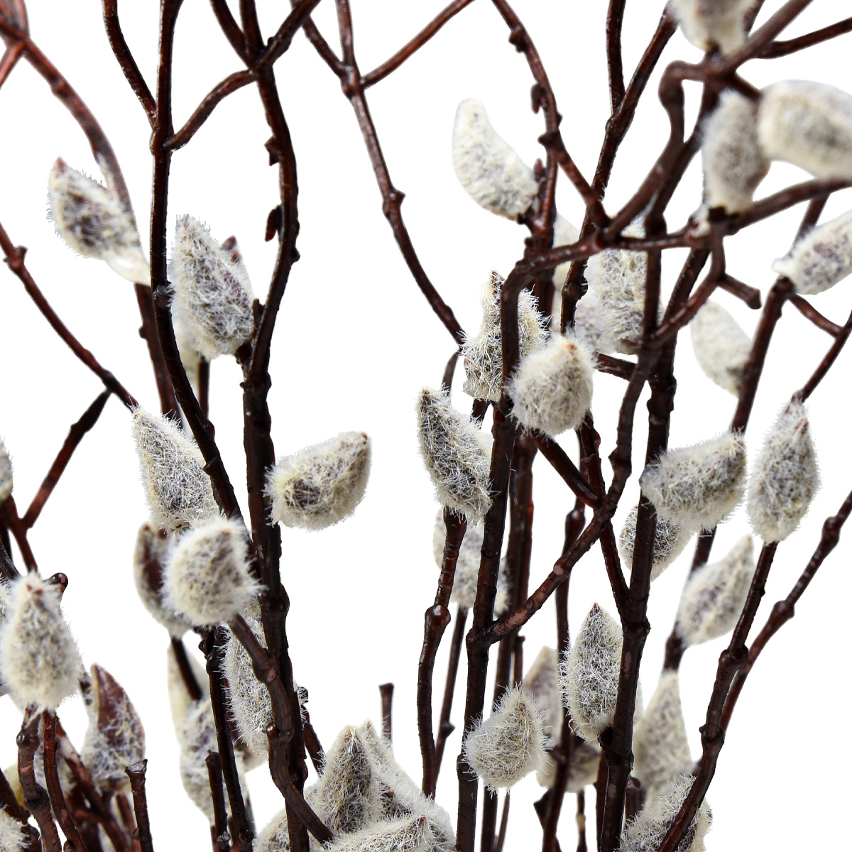 Überzeugen Sie sich selbst von dem naturgetreuen Farbverlauf und die grobe Struktur, die den Zweig der künstlichen Weidenkätzchen wie echt aussehen lassen. An der Spitze der Zweige und abgehenden Verzweigungen thronen die so markanten grauweißen Blüten. Wie auch in der Natur weisen diese viele kleine Härchen auf, die die Blütenstände samtweich werden lassen.