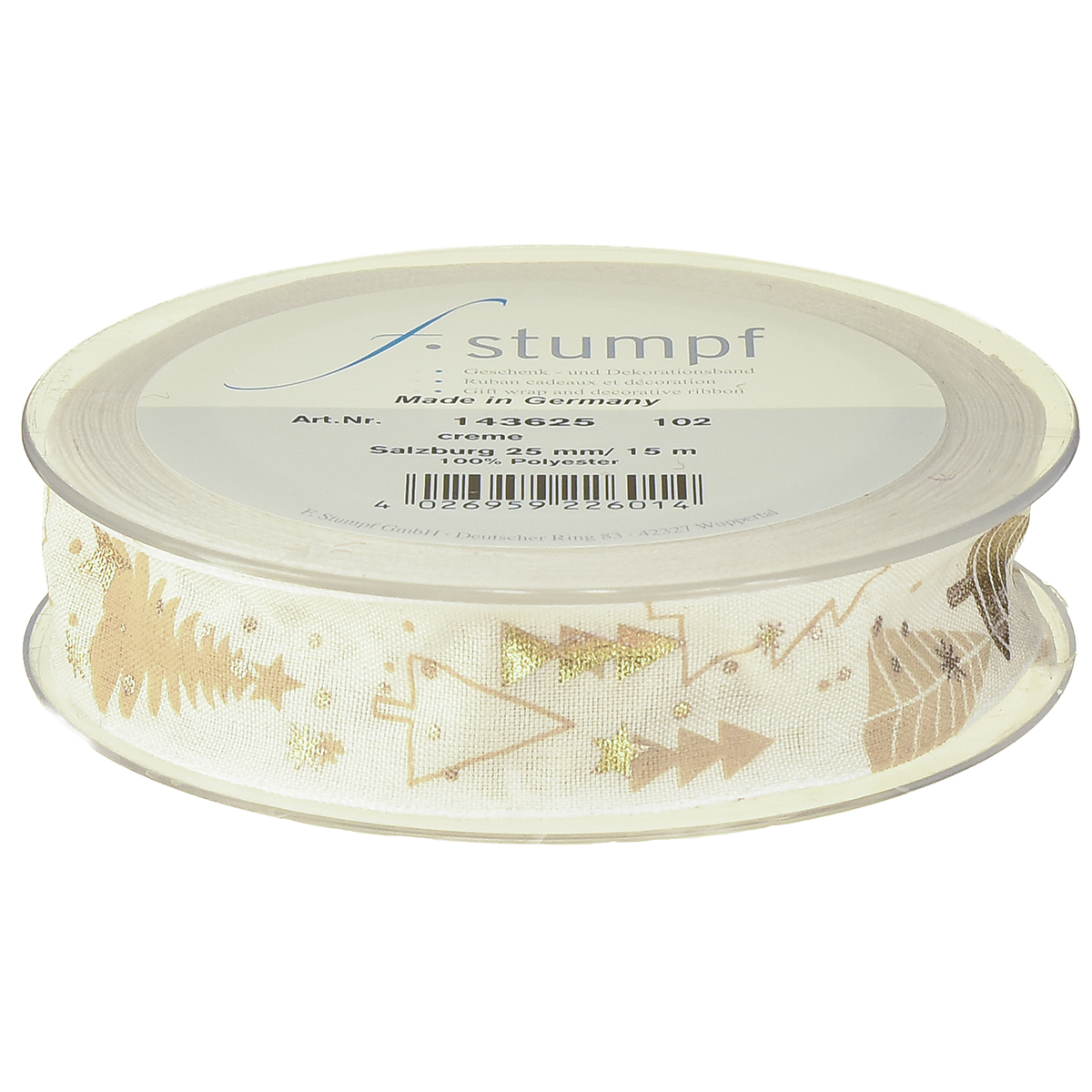 Hochwertiges Weihnachtsband Creme Gold mit Tannenbäumen 25mm x 15m für natürliche Dekoration Floristik21