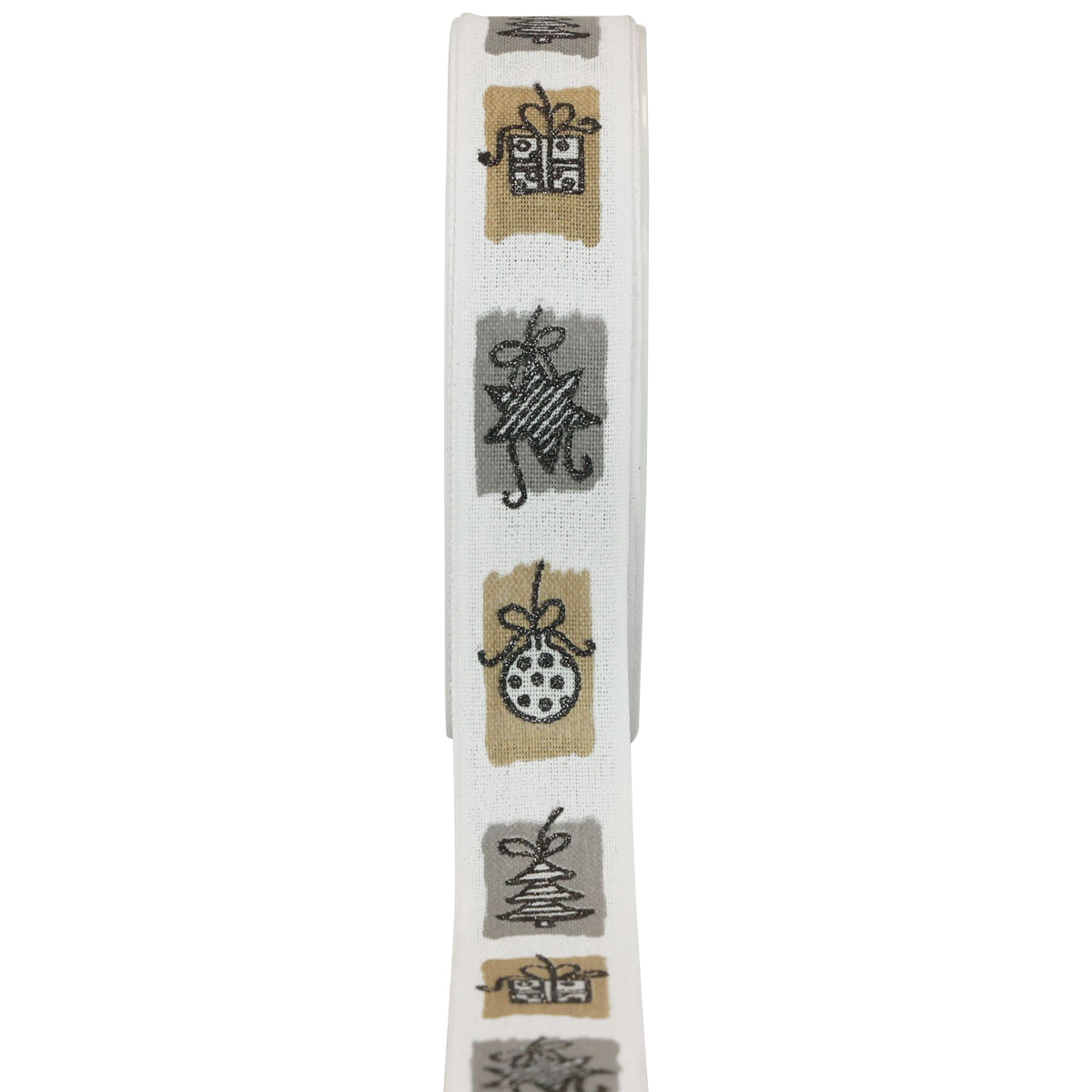 Das weiße Stoffband ist auf der Vorderseite mit vier unterschiedlichen Weihnachtsmotiven bedruckt. Jedes Motiv ist abwechselnd in Grau und Ocker unterlegt. Die formstabile Kante gibt Schleifen mehr Halt und das Band knittert nicht.
