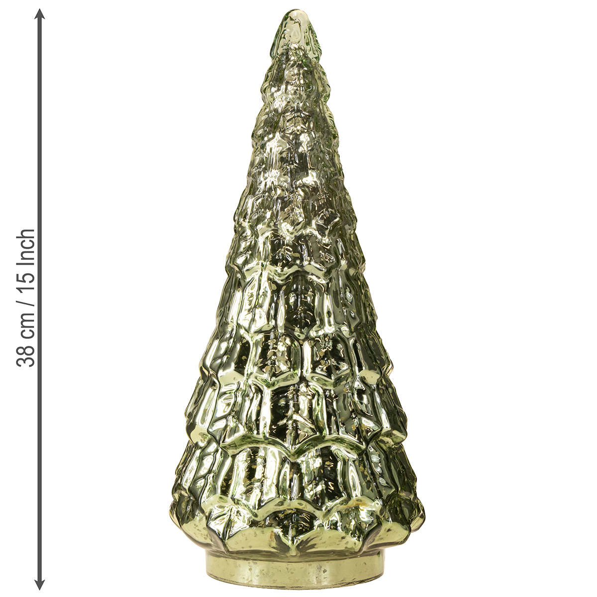 Dieser 38 cm hohe, grüne Weihnachtsbaum mit goldenen Akzenten ist nicht nur ein Blickfang, sondern auch vielseitig einsetzbar. Im Stil klassischer Vintage-Deko gefertigt, besticht er durch sein Glasmaterial mit raffinierter Farbgebung. Die LED-Beleuchtung zaubert eine warme, behagliche Atmosphäre und verleiht Ihren Arrangements nostalgischen Charme.