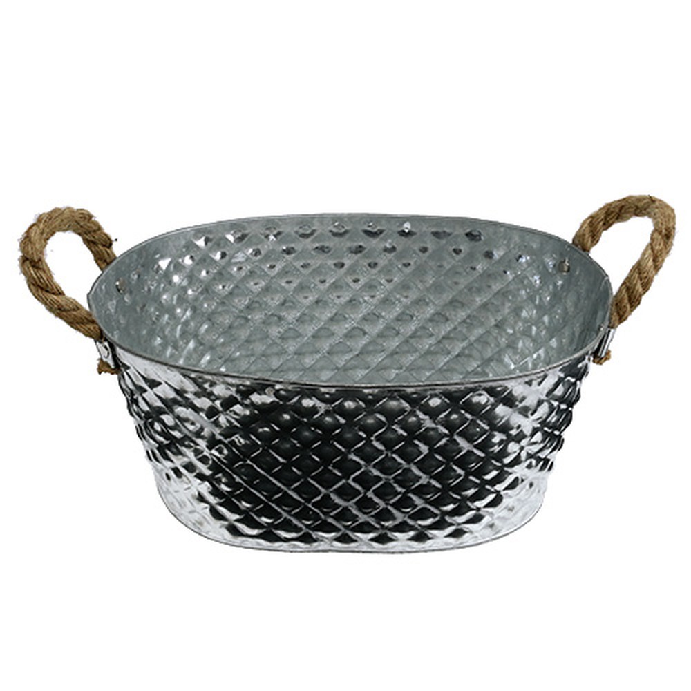 Die ovale Zinkschale mit weißgewaschenem Rautenmuster und Seilgriffen hat die Maße 31 x 20 Zentimeter und ist ungefähr 15 Zentimeter hoch. Sie ist als Übertopf und zur Aufbewahrung geeignet.