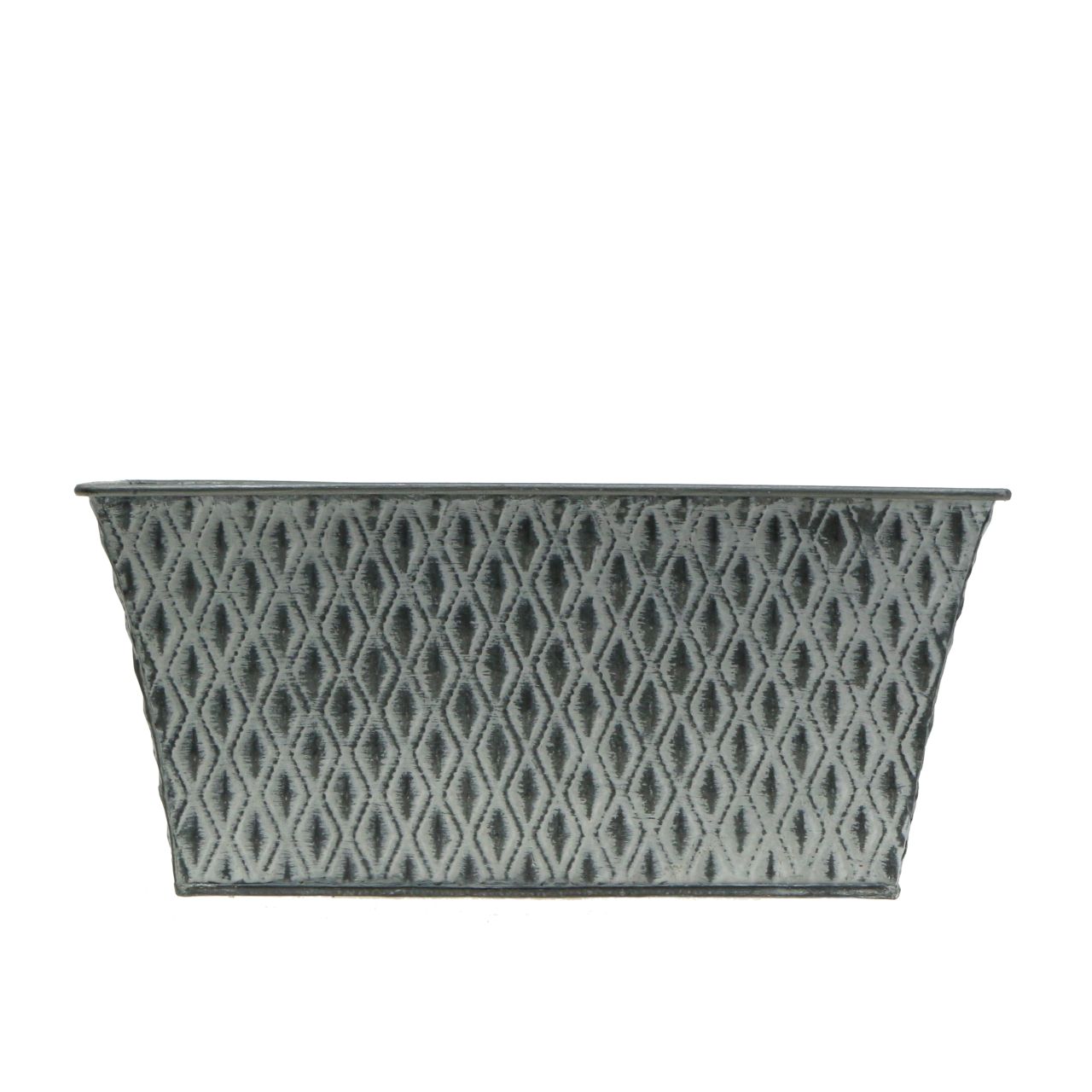 Der rechteckig geformte Zinktopf mit Rautenmuster hat die Maße von circa 26 mal 15,5 Zentimetern. Die Höhe liegt dabei bei etwa 12 Zentimetern.